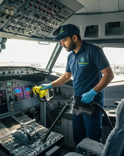 Encompass thorough carpet and upholstery vacuuming, sanitization of all seats, tray tables, windows, and panels, comprehensive disinfection of lavatories and galleys, and careful cockpit dusting with non-abrasive tools.